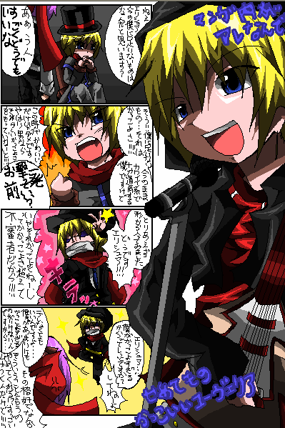 でもギターは描けない。なんという適当さだ・・・!!!管理人の趣味一杯の絵だね!痛いね! ただ絵もプラスして描きたかっただけです、毎度自己満足でさーせん! エリシュアもうツッコミ役定位置だな!!!!あと髪が異常に毒々しい(言うな おかしいな・・・本来こういうキャラ作りじゃなかったのに・・・( え?ラン様はもちろん好きですよ(信用なくなってきた ユー君はかっこいいものとかっこいいものを組み合わせれば もっとかっこよくなるとか思ってるんだよ!!! かっこいいの基準がおかしいのでこのこの場合しょうがない(( 放置時間もかけてこれ実は7時間かかった絵なんだぜ・・・見えないだろ・・・ PR この記事にコメントする
