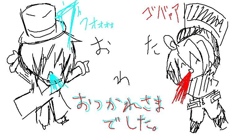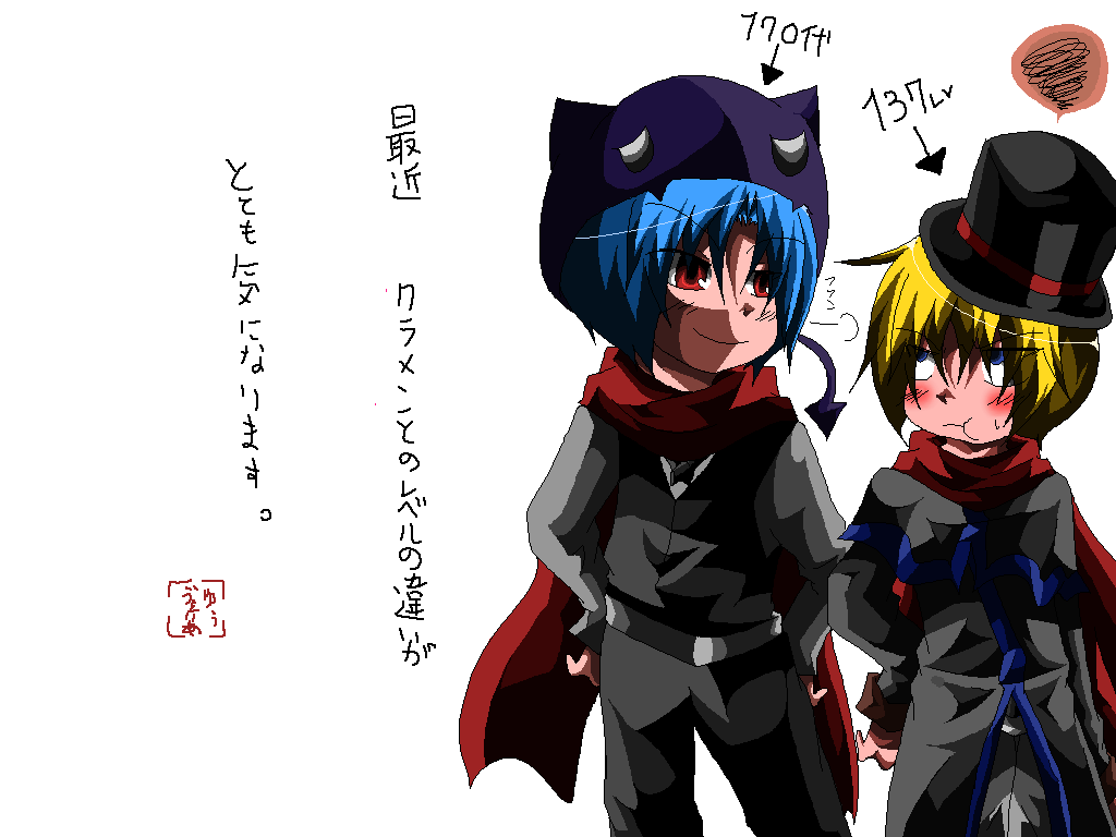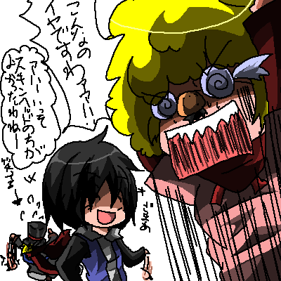 でもやる気起きない!!笑顔のナヤが描きたい!! 誰か、誰かオラに気力をおおおおおおお!(黙れ 目が覚めると自分は アフロヘアーになっていた! ショックを隠し切れないミルサート。 もはや笑うしかないユーヴェリア。 取合えずソルライルの慰めの一言。 「スキンヘッドの方が似合うね」 ご期待あれ!! 新・いきなり次回予告 ↑これでやってみた。 暇つぶしに遊んでみるといいかも!!! 人様のブログで見つけて自キャラ名でやってみたら吹いたじゃないか! ミルサートが可哀想な役割になりました。ネタ装備大好き者の宿命だね!!(( アフロと鼻眼鏡の組み合わせはネタ装備の神だと思います!ウフ!! しかしソルライルが毒舌とは・・・あれ何か脳内設定とモロ逆ですね。だがそれがいい! こっから先の絵は見ても文句なんて受け付けないんだから!! 心の中で言ってよねっ!(UZEEEEEEEEEEEEEEE ↓あまりにもくそ恥ずかしい自キャラかぷ絵になったのでサムネ化して ごまかしときます! ベルフォーマきめええええええソルライルもう誰!!! なんで俺ホントこの2人でこんな絵描いたんだ。この腐れ脳内があああ! サンドリヲン聞いてたら自然にこんな絵思い浮かんだ。 サンドリヲン=フランス語でシンデレラらしいので あんまこの絵関係ありませんね!!いいよ書きたかっただけだもの!(言い訳きた 最近ボカロはまりに足突っ込んでてやべえええええ ソルライルとベルフォーマの2キャラこれでも大好きです。愛着はちゃんとあります!! ソルライルなんて一応元1stキャラだからね!! 出番を少しは増やそうと思ってやったんだもん、後悔はしていない!! 最近オリジも描きたいなあ・・・・ TWだけじゃなんか見てて飽きてくるからね!!! ちょっとはジャンル増やそうかしらと模索中・・・!!!